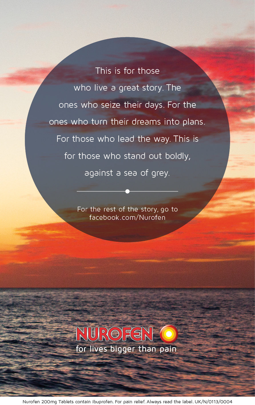 Nurofen is not just for pain. Nurofen is for Lives Bigger than pain. People rather get on with life than roll about in the self-absorbed drama of pain.
